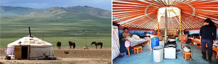 তবে কিছুক্ষণের মধ্যেই রাস্তার দুই দিকেই দেখতেপেলাম নমনীয় ঢালের বিস্তীর্ণ হালকা সবুজ তৃণভূমি। কিছু পরপর সাদা রঙের গোলাকার তাঁবু। প্রতিটি তাঁবু ঘিরে সামান্য কিছু মানুষ দেখা যাচ্ছে। এই গোলাকার তাঁবুগুলোকে ওদের ভাষায় বলে গের। আবার মঙ্গোলদের সঙ্গে যেহেতু তুর্কমেনিস্তান ও বর্তমান চীনের শিনজিয়াং অঞ্চলের উইঘুর জাতি এবং মধ্য এশিয়ার তুর্কি বংশোদ্ভূত জাতিগুলোর ভাষাগত অনেক আদান-প্রদান হয়েছে তাই তুর্কি শব্দ ইয়ুর্তও এ গেরের প্রতিশব্দ হিসেবে তারা ব্যবহার করে।